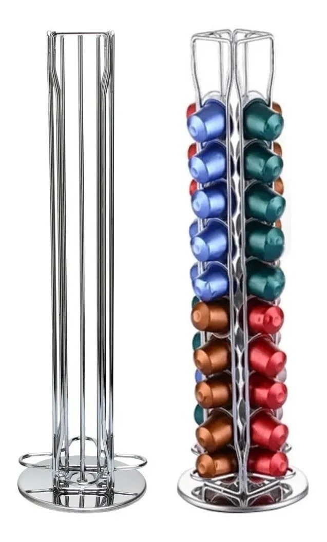 Porta cápsulas de café Nespresso. Estructura fija (no giratorio). Metal cromado. Capacidad: 40 cápsulas. Alto: 34cm.