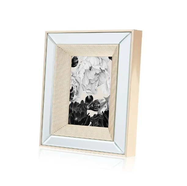 Portarretrato de marco espejado biselado con faja central en acabado metálico para destacar tus fotografías. Línea de estilo moderno y atemporal, para un look con estilo en tu deco. Tamaño de la foto: 13x18cm. Tamaño con marco incluido: 22x27cm