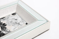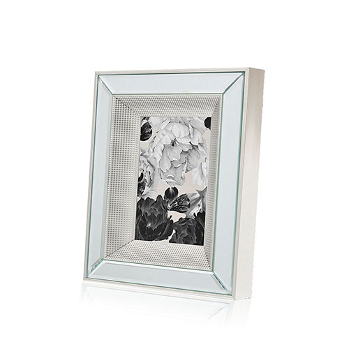 Portarretrato de marco espejado biselado con faja central en acabado metálico para destacar tus fotografías. Línea de estilo moderno y atemporal, para un look con estilo en tu deco. Tamaño de la foto: 20x25cm.