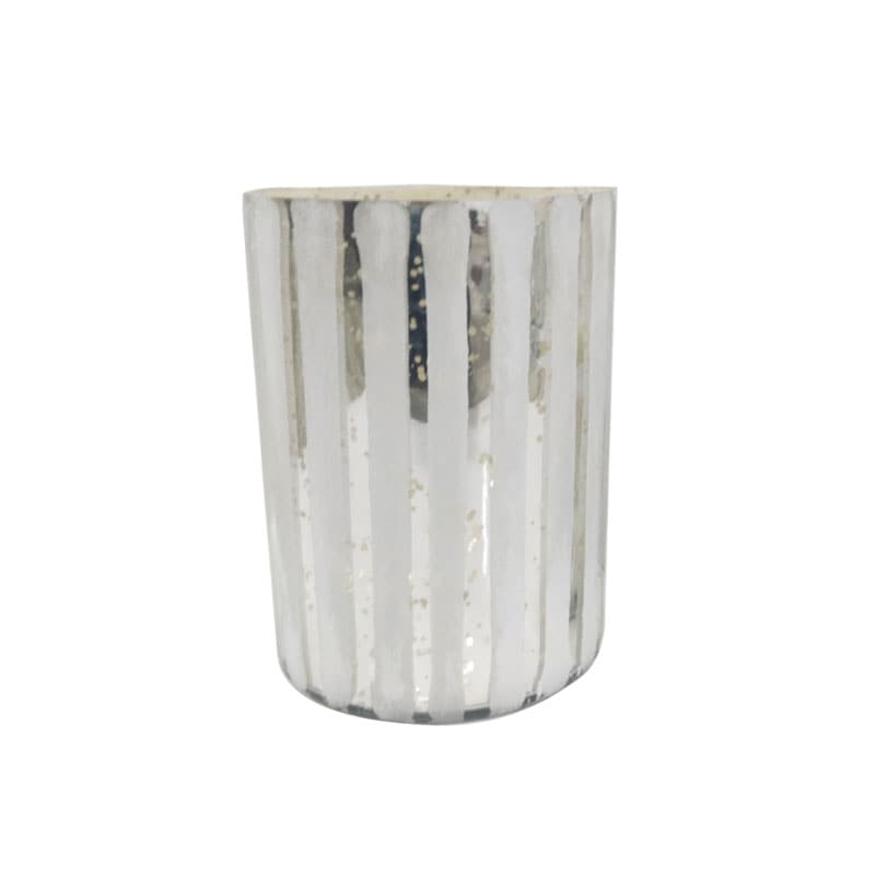 Portavela cilíndrico de vidrio mercurizado color plata. Patrón de diseño rayas en color blanco mate. Alto: 10cm