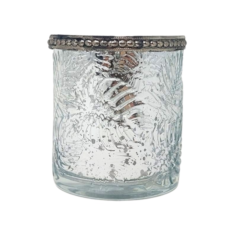 Portavela de vidrio mercurizado color plata. Texturado de hojas. Cenefa metálica color plata. Diámetro: 10cm. Alto: 13cm
