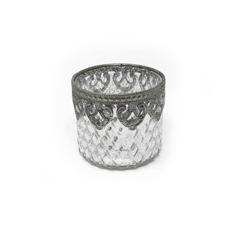 Portavelas de vidrio mercurizado color plata. Textura rombos pequeños. Borde metálico plateado tipo cenefa. Dimensiones: 8x8x7cm