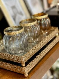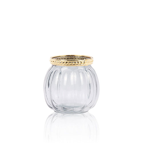 Portavelas de vidrio color gris. Aplique metálico en el borde. Dimensiones: 8×7,5cm.