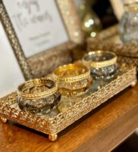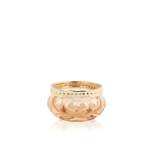 Portavela de vidrio con tachas. Color nude, borde con aplique metálico. ¡Accesorio ideal para una vela o un toque de glam en cualquier rincón de tu hogar y atraer todas las miradas! Dimensiones: 6×3,5cm.