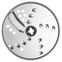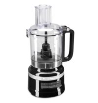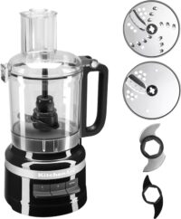 Marca KitchenAid. Procesadora de alimentos. Accesorios incluidos: cuchilla multiusos y cuchilla para masa, 2 discos reversibles para cortar en tiras finas (2mm) y medianas (4mm), disco para cortar grueso (6 mm). Ensamblaje en un solo clic, sin giro, montaje directo del bowl y bloqueo de la tapa. 3 controles de velocidades: alta, lenta y pulso. Bowl resistente a fugas. El recipiente, la tapa y los accesorios son aptos para lavavajillas. Fácil de almacenar: diseño compacto, accesorios que se guardan en el recipiente y guarda cable en la base. Capacidad: 2,1 litros (9 tazas). Dimensiones: 24,5×20×42,5cm. Peso: 2,8kg