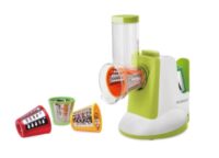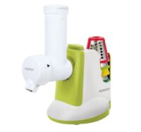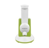 Marca Peabody. Rallador eléctrico con accesorios. 150w de potencia. 5 cuchillas diferentes: corte juliana, corte grueso, corte fino, rallado grueso, rallado fino. Accesorio empujador de alimentos y organizador de cuchillas incorporado. Incluye accesorio de Smoothie / helado.