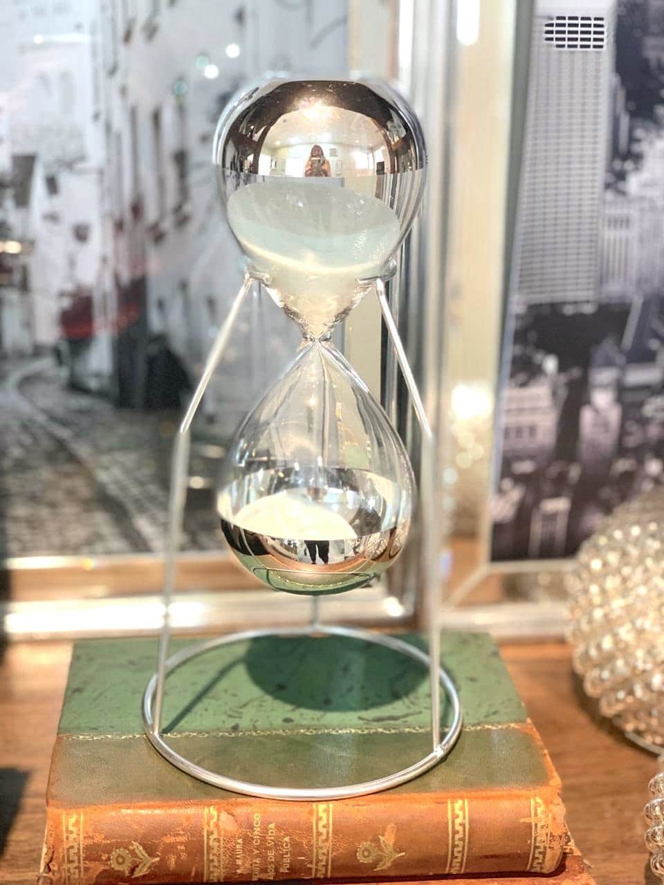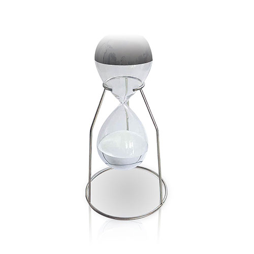 Reloj de arena con soporte de hierro plata. Marca el paso del tiempo y nos maravilla con su elegante presencia. ¡El elegido para una oficina o biblioteca! Dimensiones:13x25cm