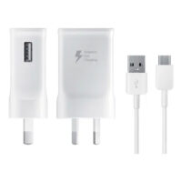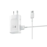 Marca Samsung. Cargador carga rápida con cable. Color blanco. Conector de entrada tipo A. Conector de salida tipo C. Voltaje de entrada: 110V/220V (Bivolt). Voltaje de salida: 5V