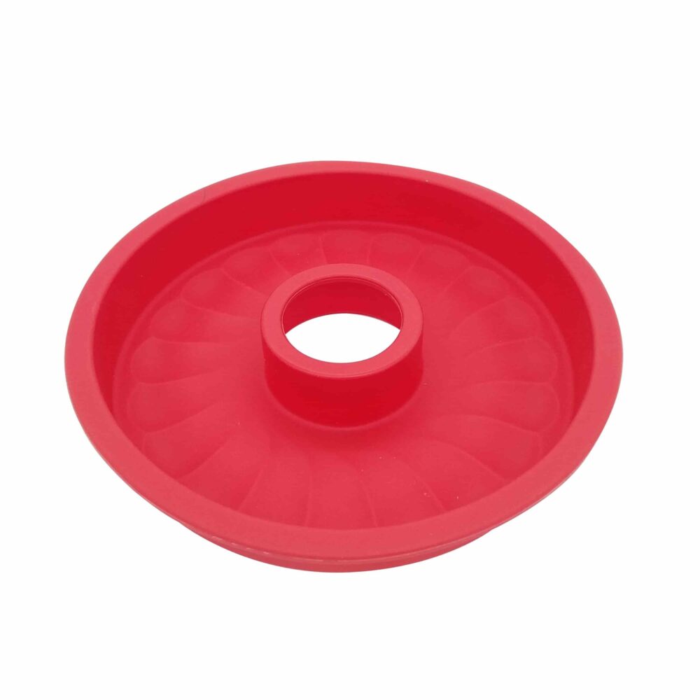 Savarin de silicona. Antiadherente. Fácil de lavar. Apto para horno colocándola sobre una placa o bandeja. Color rojo. Diámetro: 23cm. Alto: 4cm
