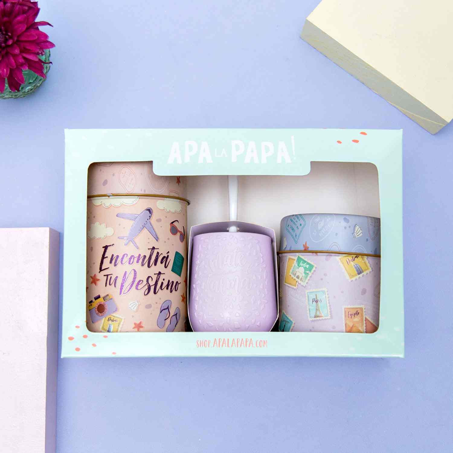 Set de contenedores metálicos para yerba y azúcar + mate con bombilla y disco extractor de yerba. Yerbera 400cc.: contenedor metálico litografiado con detalles metalizados y tapa con pico vertedor de plástico, diseño viajes. Azucarera 200cc.: contenedor metálico litografiado con detalles metalizados y tapa con pico vertedor de plástico, diseño viajes. Mate 3D: de melamina con diseño en relieve 3D al tono con el diseño de las latas. Bombilla con disco: sistema de fácil limpieza. Presentación en caja impresa con ventana.