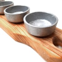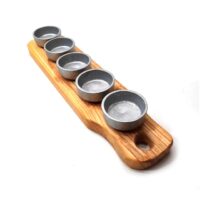 Set de tabla de madera + 5 cazuelas chicas de alumino.