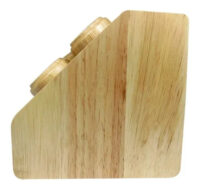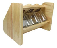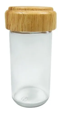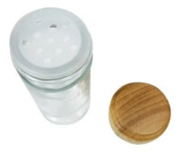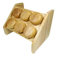 Especieros de vidrio. Tapa y base de madera. Largo: 19,5. Ancho: 15cm. Alto: 15cm. Diámetro del especiero: 4cm. Alto del especiero: 10cm