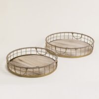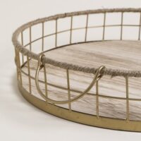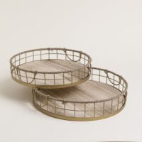 Set x2 bandejas redondas de hierro color dorado y madera. Dimensiones: 40x8cm y 35x7cm