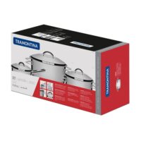 Marca Tramontina. Línea Solar. Batería de cocina 4 piezas. Acero inoxidable. Fondo triple (acero inoxidable – aluminio – acero inoxidable) que distribuye el calor uniformemente, proporcionando una cocción más rápida, puede mantenerse el fuego bajo durante toda la preparación y así ahorrar energía. Comidas más sanas, el acero inoxidable no libera ningúntipo de residuo. Sus tapas tienen salida de vapor y encaje perfecto. Apto cocción a gas, eléctrica, vitrocerámica e inducción. Apto lavavajillas. Recomendaciones: evitar dejar alimentos en las ollas durante mucho tiempo, puede provocar manchas. Para mantener los elementos de cocina siempre lindos y brillantes, después del lavado séquelos inmediatamente. El juego incluye: 1 cacerola 24cm 4,7l Solar, 1 cacerola honda 20cm 3,60l Solar, 1 olla 16cm 1,4l Solar, 1 sartén 24cm 2,10L