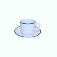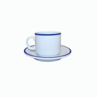 Marca Tsuji. Taza de café con plato de porcelana blanca decorada con filete azul en borde. Apto lavavajillas, horno y freezer. Apto microondas. Ancho de la taza: 6,2cm. Alto de la taza: 5,1cm. Capacidad: 90ml. Peso de la taza: 112gr. Diámetro del plato: 11,5cm. Peso del plato: 108g