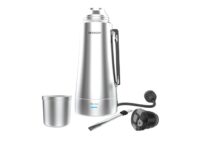 Marca Peabody. Termo eléctrico E-Termo. Capacidad: 1 litro. Doble capa de acero inoxidable con aislación de vacío (18/8). Libre de PBA2. Temperaturas de corte: “MATE” en 75° y “MÁX” en 90°. Indicador luminoso de temperatura. Tapón cebador con cierre antigoteo. Tapa mate térmica, conserva la temperatura durante toda la cebada y logra que la yerba se lave menos. Bombilla de acero inoxidable que no se tapa y de fácil limpieza. Incluye cable de alimentación extraíble, para calentar el agua donde quieras en 6 minutos. 700W de potencia. Medidas: Medidas: 33cm de alto, 12cm de ancho, 12cm de profundidad.