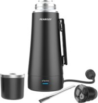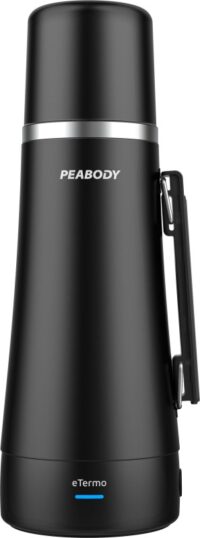 Marca Peabody. Termo eléctrico E-Termo. Capacidad: 1 litro. Doble capa de acero inoxidable con aislación de vacío. Libre de PBA2. Temperaturas de corte: “MATE” y “MÁX”. Indicador luminoso de temperatura y stand by. Tapón cebador con cierre antigoteo. Tapa mate térmica, conserva la temperatura durante toda la cebada y logra que la yerba se lave menos. Bombilla integrada en la manija, no se tapa y de fácil limpieza. Incluye cable de alimentación extraíble, para calentar el agua donde quieras en 6 minutos. 700W de potencia. Medidas: Medidas: 33cm de alto, 12cm de ancho, 12cm de profundidad.