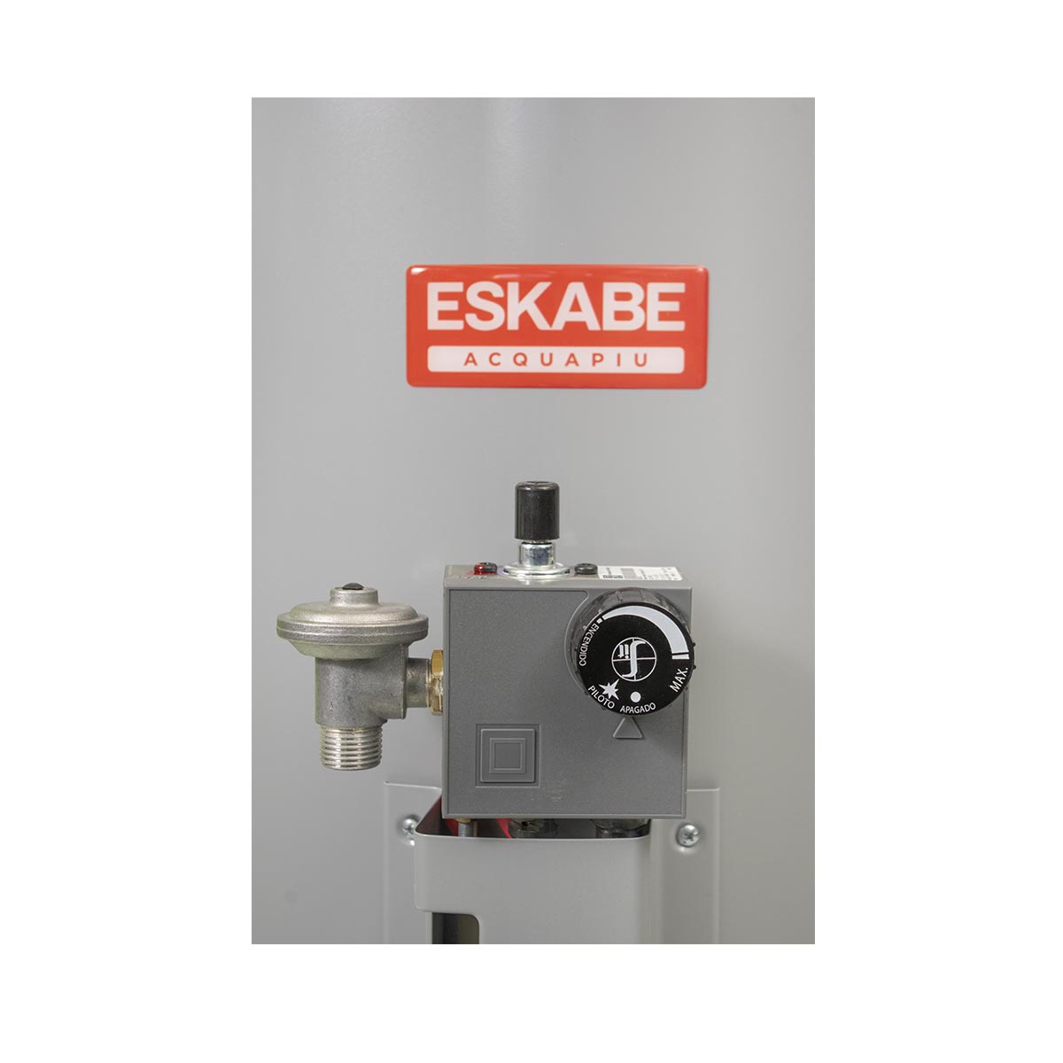 Marca Eskabe. Termotanque Multigas Línea Acquapiú. Modelo A4SVJ. Capacidad de recuperación: 700 litros/hora. Capacidad del tanque: 40 litros. Sistema multitubular: 4 Potentes tubos. Aislación de poliuretano. Salida de gases 4″ vertical. Encendido piezoeléctrico. Termostato Regulación de Temperatura. Control salida de gases MonoxiProtector. Válvula de seguridad. Válvula de alivio. Regulador de presión (sólo Gas Natural). Entrada y salida de agua superior. Montaje: de pie. Diámetro del Gabinete: 45cm. Altura Gabinete incluido interceptor: 93cm. Color gris plata. Eficiencia Energética: B.