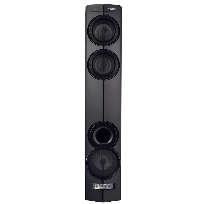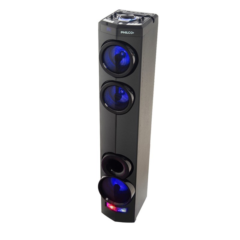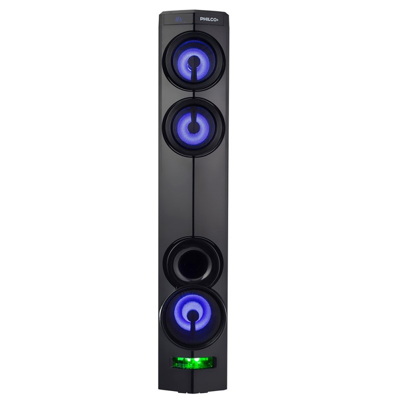 Marca Philco. ModeloTAP350P. Torre de audio. Potencia 3000W. Bluetooth. 2 Puertos USB, Slot para tarjetas Micro SD. Entrada para 2 Micrófonos y Auxiliar 3,5mm. Radio FM. Salida para Auriculares. 5 Ecualizaciones pre-Seteadas, Bass Control. Doble Woofer de 4″ + Subwoofer de 5.25″. Luces estilo Fiesta RGB PARTY LIGHT. MusicRecording: Función de grabación. Control Remoto. Micrófono Incluido.