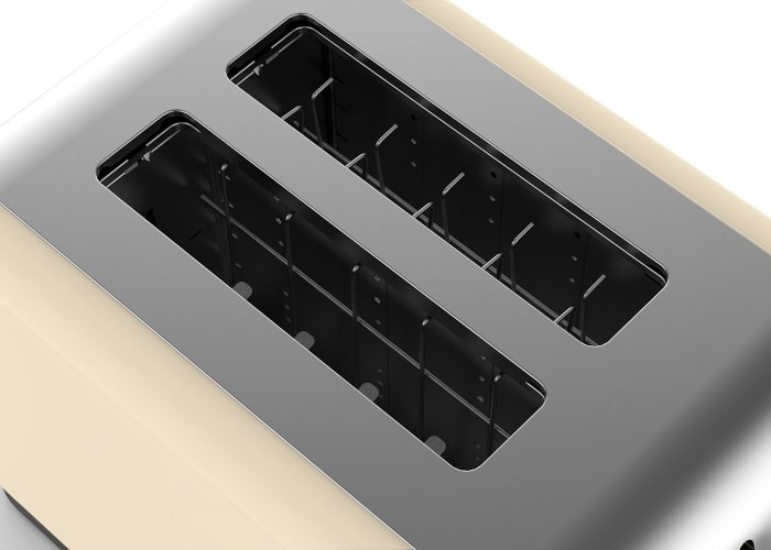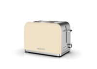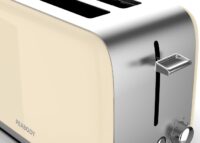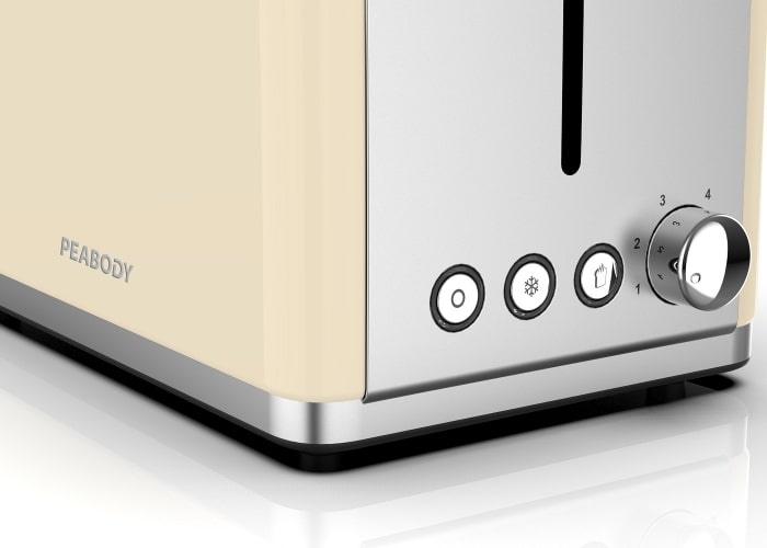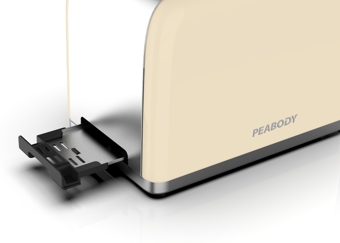 Marca Peabody. Tostadora dos ranuras. Cuerpo de acero inoxidable. 1050W de potencia. 3 Funciones: descongelar, recalentar y cancelar. 6 niveles de tostado. Bandeja colectora de migas extraíble. Espacio guarda cable. 2 Ranuras anchas.