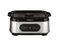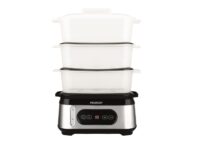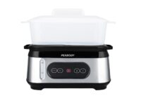 Marca Peabody. Vaporera. Modelo PE-ST1000IX. 3 Bandejas de cocción de 3L de capacidad cada una. 950W de potencia. Capacidades: 9 L de capacidad total. Tanque de agua de 1,8 L. Bowl para arroz de 1,5 L de capacidad. Cuerpo de plástico con detalles de acero inoxidable. Display digital. Visor de nivel de agua. Indicadores lumínicos de funcionamiento. Capacidad de agregar agua en funcionamiento. Alarma de “falta de agua”. Espacio guardacables. Timer 12 horas. Vapor instantáneo