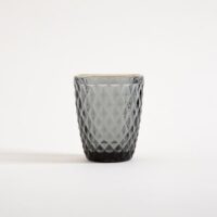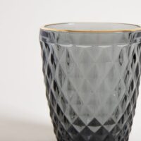 Vaso bajo de vidrio. Línea diamante. Color verde humo. Borde dorado. Diámetro: 8cm. Alto: 10cm