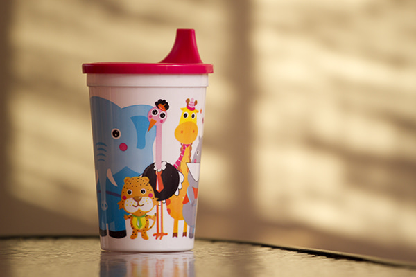 Vaso infantil de plástico. Diseño animales. Tapa con pico sorbito de colores surtidos. Diámetro: 8,5cm. Alto: 15cm. Capacidad: 500ml