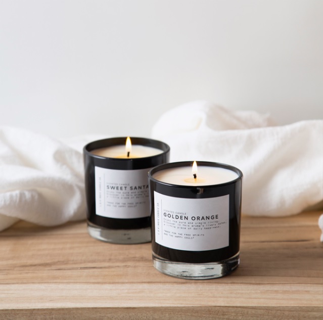 Vela de cera de soja. Fragancia Sweet Santal (Cardamomo, Violeta y Sándalo). Portavela de vidrio color negro brillante. Tamaño: 8,5cm x 8,5cm. Duración: 50/60hs.