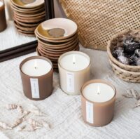 Vela de cera de soja. Fragancia White Tea (Té Blanco, Jengibre Y Aloe). Portavela de vidrio color natural acabado mate. Tamaño: 8,5cm x 8,5cm. Duración: 50/60hs.