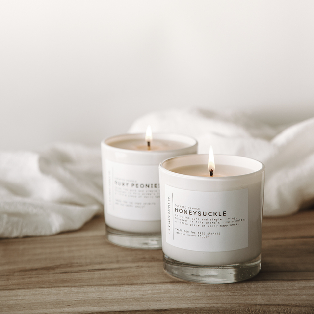 Vela de cera de soja. Fragancia Calm Fields (Tilo e Hibiscus). Portavela de vidrio color blanco brillante. Tamaño: 8,5cm x 8,5cm. Duración: 50/60hs.