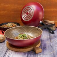 Marca Jovifel. Línea Rivoli. Wok de aluminio con 5 capas de revestimiento antiadherente. Por su tamaño y antiadherencia es ideal para salteados de carnes y verduras teniendo una cocción perfecta. Apto lavavajillas. Diámetro: 28cm. Alto: 9cm. Capacidad: 4,9l